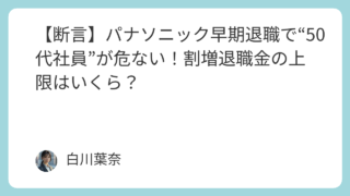 社会問題・詐欺・トラブル系 【断言】パナソニック早期退職で“50代社員”が危ない!割増退職金の上限はいくら? パナソニックが実施する早期退職は、50代の社員にとって特に重大な転機です。高額な割増退職金が支給される一方で、再就職の厳しさや老後資金の不安が重くのしかかります。✅ここがポイント「割増退職金は最大で4000万円近く、55歳前後が最も優遇され... 2025.09.27 社会問題・詐欺・トラブル系