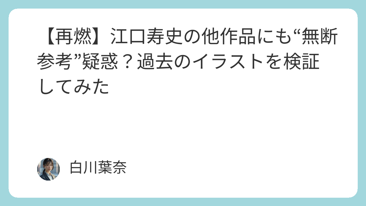 本記事では、江口氏の過去作品で指摘されてきた“無断参考/トレース疑惑”を整理し、創作と引用の境界線、そしてプロとしての倫理観について掘り下げます。
